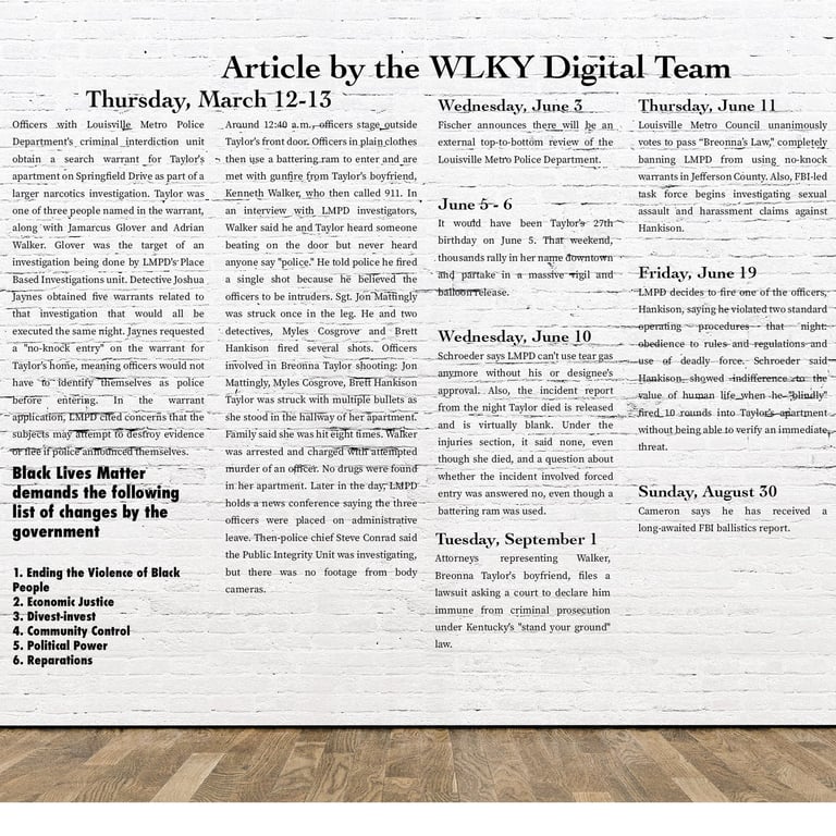 The designs for the entrance and wall at the University of North Carolina at Charlotte were created to present a clearer, more readable narrative for viewers. While the story originates from the WLKY Digital Team, each paragraph, sentence, and phrase is given equal space and breathing room, allowing viewers to thoughtfully engage with and better understand Breonna Taylor’s story.