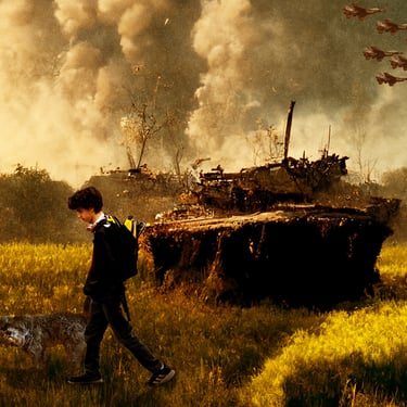 This series offers a speculative glimpse into a future shaped by the normalization of constant war—much like how social distancing became routine during the pandemic. Through a sequence of images, we follow the journey of a young boy, Nathan Wallace, as he leaves his home in an attempt to escape the relentless presence of conflict.